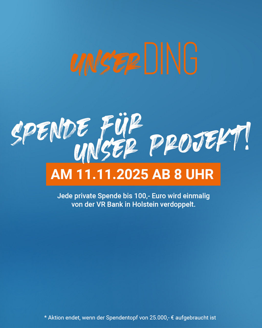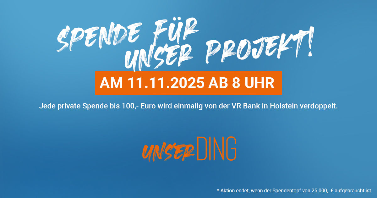 Auf der Spendenplattform „unserDING“ zeigen gemeinnützige Vereine und Organisationen aus unserer Region, wofür sie Gelder benötigen. Jeder, der spenden möchte, kann das ganz einfach und direkt online machen. Am 03.03.2026 lohnt sich eine Spende gleich doppelt: denn die VR Bank in Holstein legt einmalig auf jede private Spende den gleichen Betrag noch einmal oben drauf, maximal jedoch 100,- Euro. Für diese Aktion stellen wir einen Spendentopf von 25.000,- Euro bereit. Die Spendenverdopplungs-Aktion startet um 8:00 Uhr und endet, wenn der zusätzliche Spendentopf aufgebraucht ist.