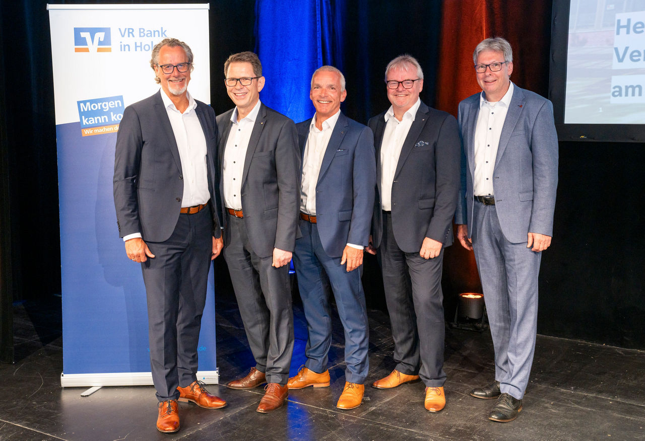 Am 23.06.2025 fand nach fünf Jahren die Vertreterversammlung der VR Bank in Holstein in Präsenz im Kulturwerk am See in Norderstedt statt. Sie präsentierten die Zahlen, Daten, Fakten sowie Aktuelles aus der Bank und führten durch den Abend (von li nach re): Stefan Witt, Uwe Augustin, Ingmar Kampling u. Andreas Jeske (Vorstand der VR Bank in Holstein) sowie Hans-Jürgen Rüpcke (Aufsichtsratsvorsitzender der VR Bank in Holstein)