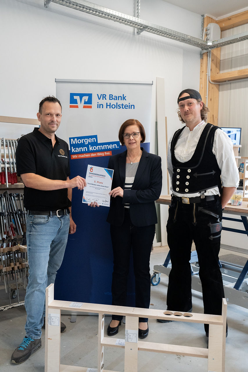 Wir freuen uns natürlich sehr mit unseren Kunden, dass sie mit ihrem innovativen Geschäftskonzept beim Handwerkerpreis erfolgreich sind“, sagte Birgit Stamer, Firmenkundenberaterin der Drittplatzierten, „Als VR Bank in Holstein begleiten wir sehr gerne unsere handwerklichen Betriebe bei allen Schritten ihrer Unternehmensentwicklung.“
