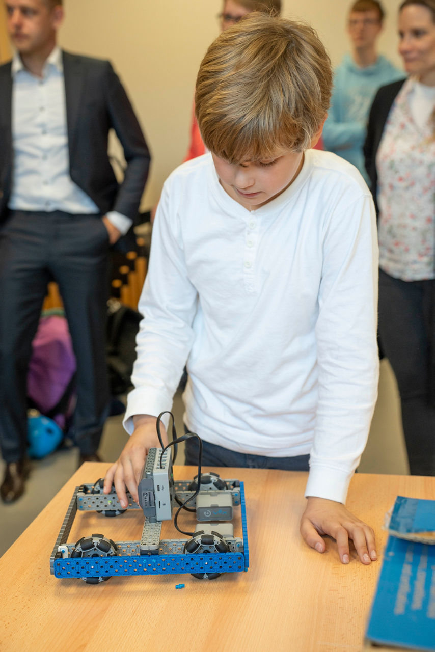 Neben der digitalen Transformation befinden sich die Schulen auch in der Bildungstransformation. Deshalb setzt die Grund- und Gemeinschaftsschule an der Bek auch auf „VR-DIGICATION", um ihre Schülerinnen und Schüler früh mit den neuen Materialen vertraut zu machen und ihnen ein forschendes Lernen zu ermöglichen. Das moderne Lernmaterial des Portfolios umfasst Themen wie Elektrotechnik, Programmierung, Sensorik, Robotik und Nachhaltigkeit. Mit „VR-DIGICATION" möchte die VR Bank in Holstein die Schulen nach ihrem individuellen Stand und Bedarf mit hochwertigen MINT-Lernmaterialien ausstatten, um Begeisterung zu wecken und Hürden abzubauen. Fachlehrkräfte haben oft kaum Möglichkeiten, praktische Projektumsetzungen anzubieten und sind teilweise gezwungen, Lernmaterialien eigenständig zur Schule zu bringen. Doch ganz neu ist das MINT-Thema der Schule in Halstenbek nun nicht, die seit 2024 schon den Titel „MINT-freundliche Schule“ trägt. Einigen Schülerinnen und Schülern sind insbesondere mit dem Thema Robotik vertraut: seit Jahren nimmt die Schule erfolgreich bei den Robotik-Wettbewerben teil. Es kommt vor, dass sie sich sogar für die Weltmeisterschaften in den USA qualifizieren. Der Fachlehrer für Sport und Spanisch – Mathias Schuldt betreut den Robotikbereich. „Ich bin da seinerzeit so reingerutscht und habe mich reingefuchst und es macht eine Menge Spaß mitzuerleben, wie begeistert die Kids mit dem Material arbeiten und sich in der Robotik-AG beteiligen.“
